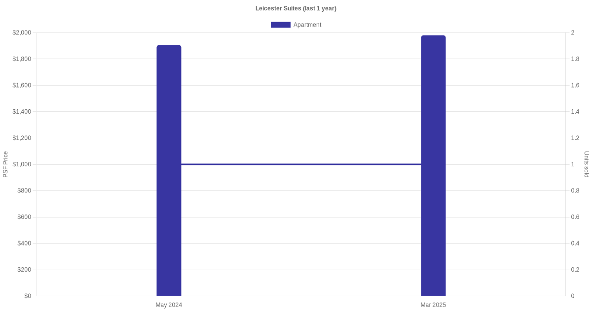 There were a total of 4 sales transactions for Leicester Suites in the last 3 years, with the latest one recorded in Mar 2025. Disclaimer : our transactions data below does not include block numbers as the data is not available.