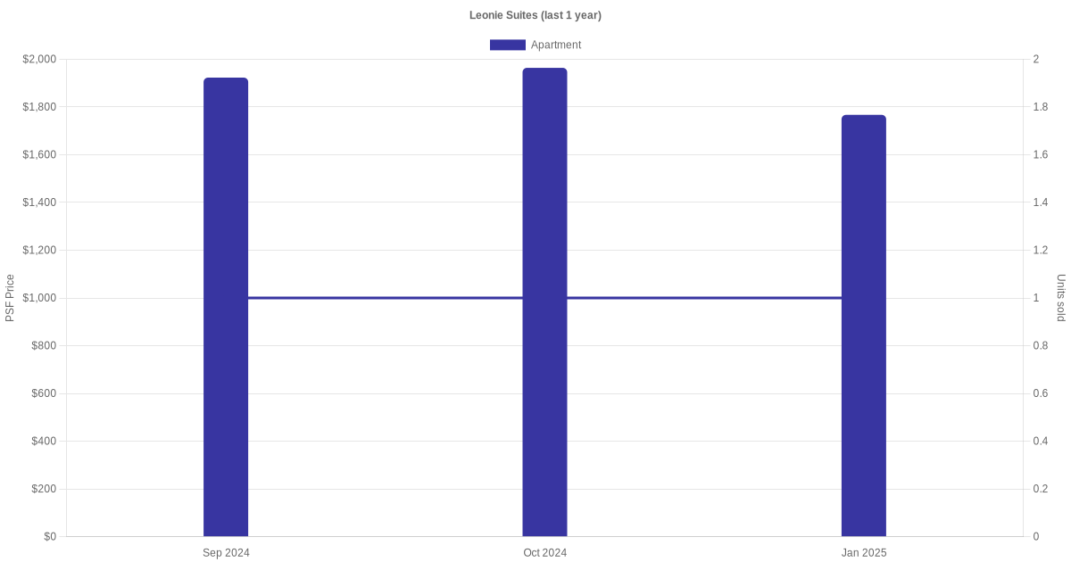 There were a total of 13 sales transactions for Leonie Suites in the last 3 years, with the latest one recorded in Aug 2025. Disclaimer : our transactions data below does not include block numbers as the data is not available.