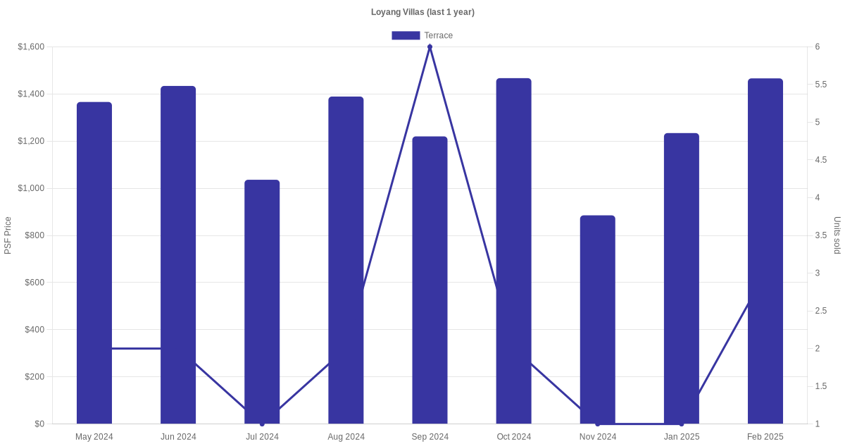 There were a total of 65 sales transactions for Loyang Villas in the last 3 years, with the latest one recorded in Nov 2025. Disclaimer : our transactions data below does not include block numbers as the data is not available.