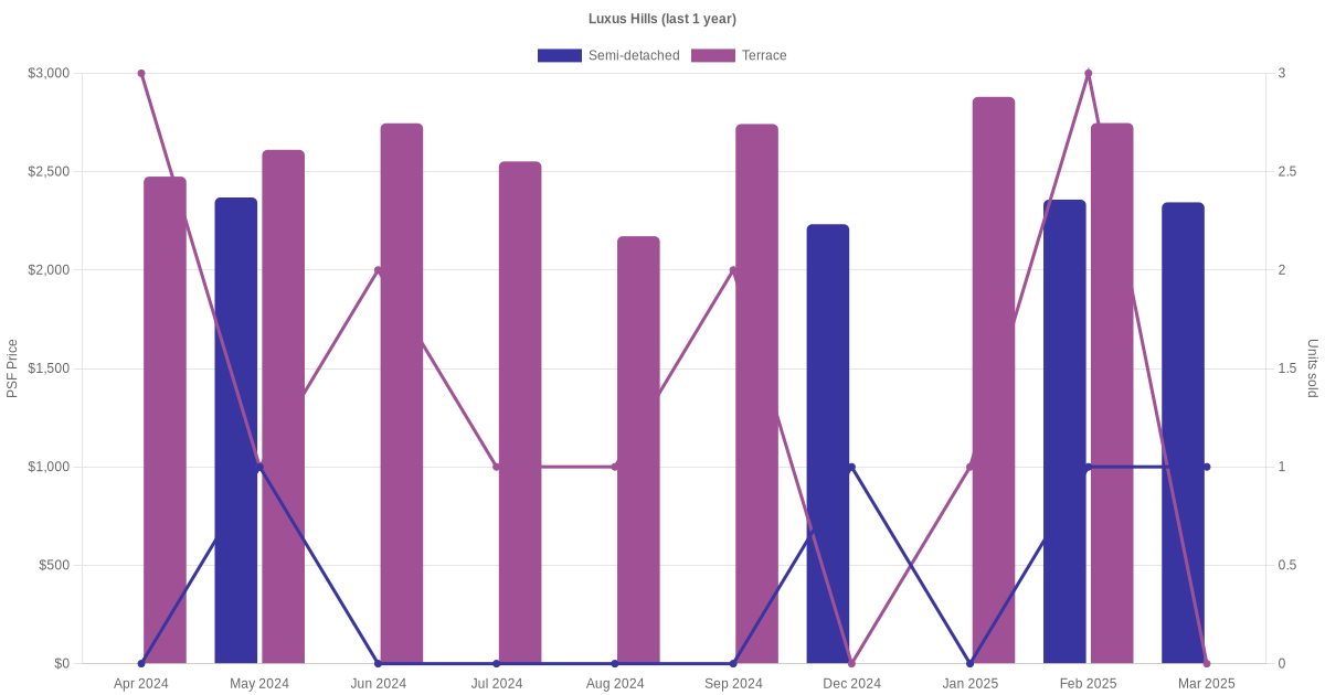 The graph below shows the average monthly transacted sale price for each of the semi-detached and terrace units for Luxus Hills in the last 3 years. This is based on the transactional data collated for Luxus Hills for the selected period.