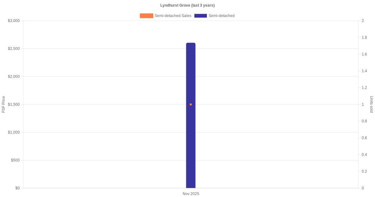 There were a total of 1 sales transactions for Lyndhurst Grove in the last 3 years, with the latest one recorded in Nov 2025. Disclaimer : our transactions data below does not include block numbers as the data is not available. If you would like to see a list of blocks / addresses associated with Lyndhurst Grove, please click here.
