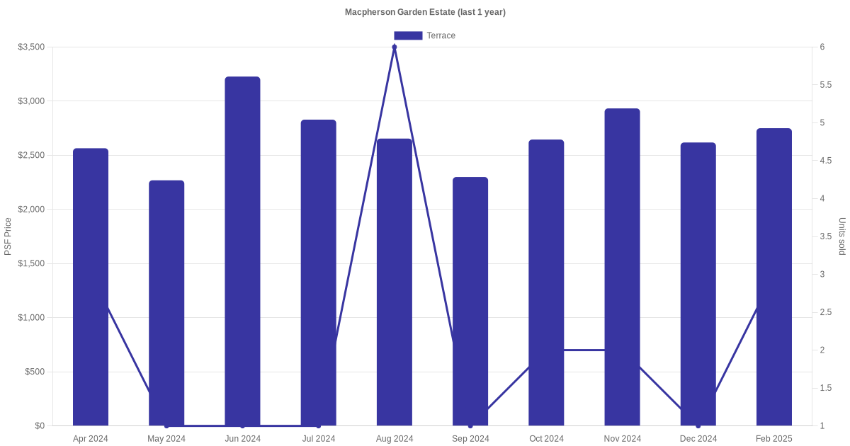 | Nov 2025 | $2,500,000 (Resale) | $2,826 | Terrace | Macpherson Garden Estate Jalan Gembira (District 13) | - | 885 sqft | Freehold | - |