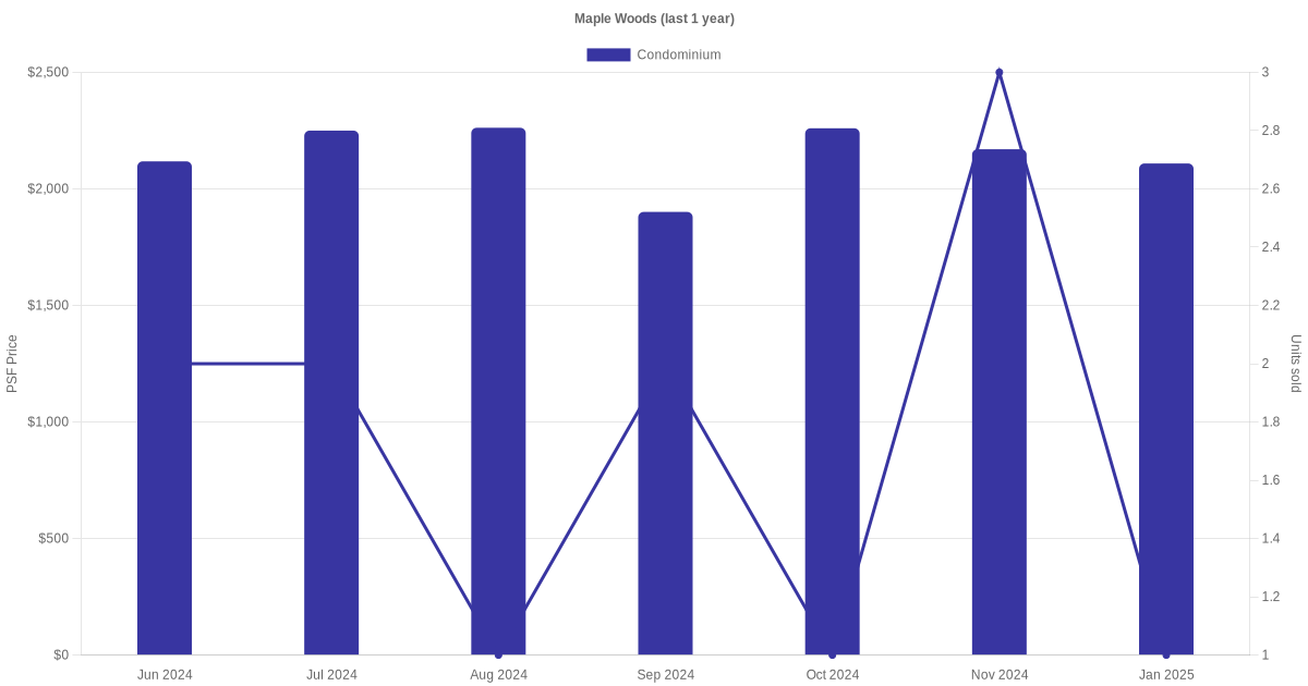 The graph below shows the average monthly transacted sale price for each of the condominium units for Maple Woods in the last 3 years. This is based on the transactional data collated for Maple Woods for the selected period.