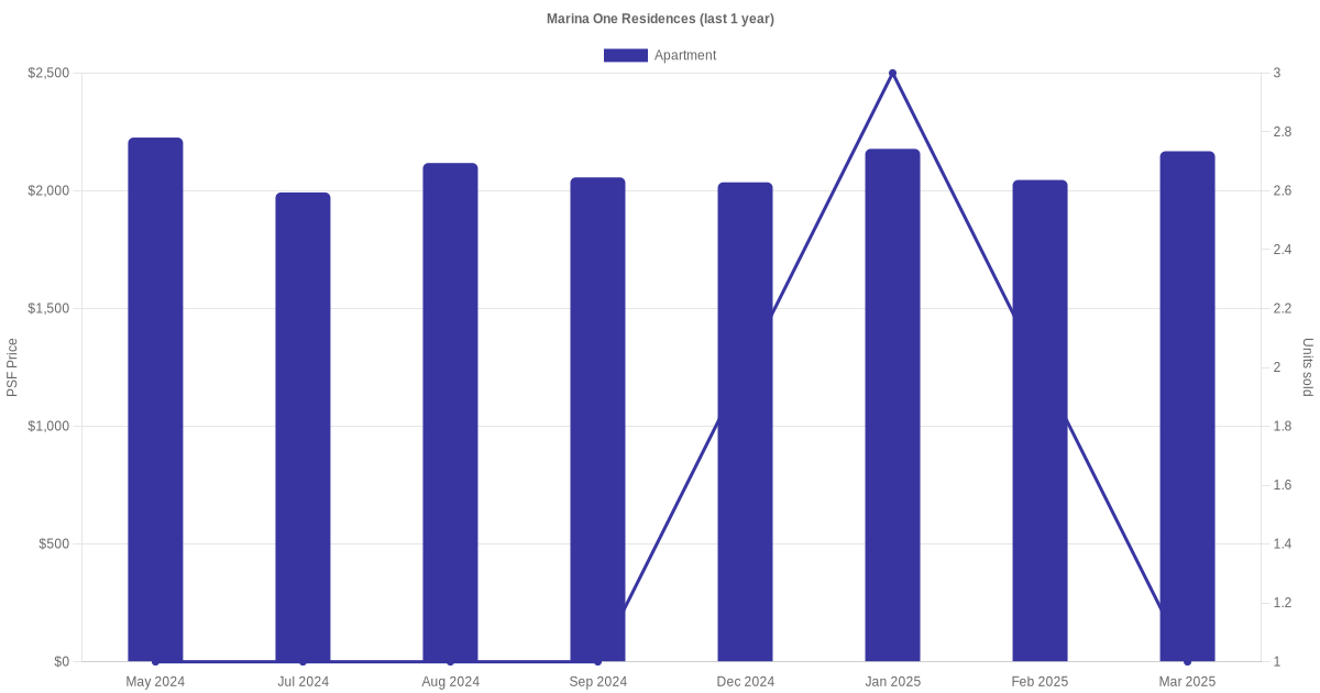 | Apr 2025 | $2,608,000 (Resale) | $2,036 | Apartment | Marina One Residences Marina Way (District 01) | 06-10 | 1281 sqft | 99 years | 2011 |