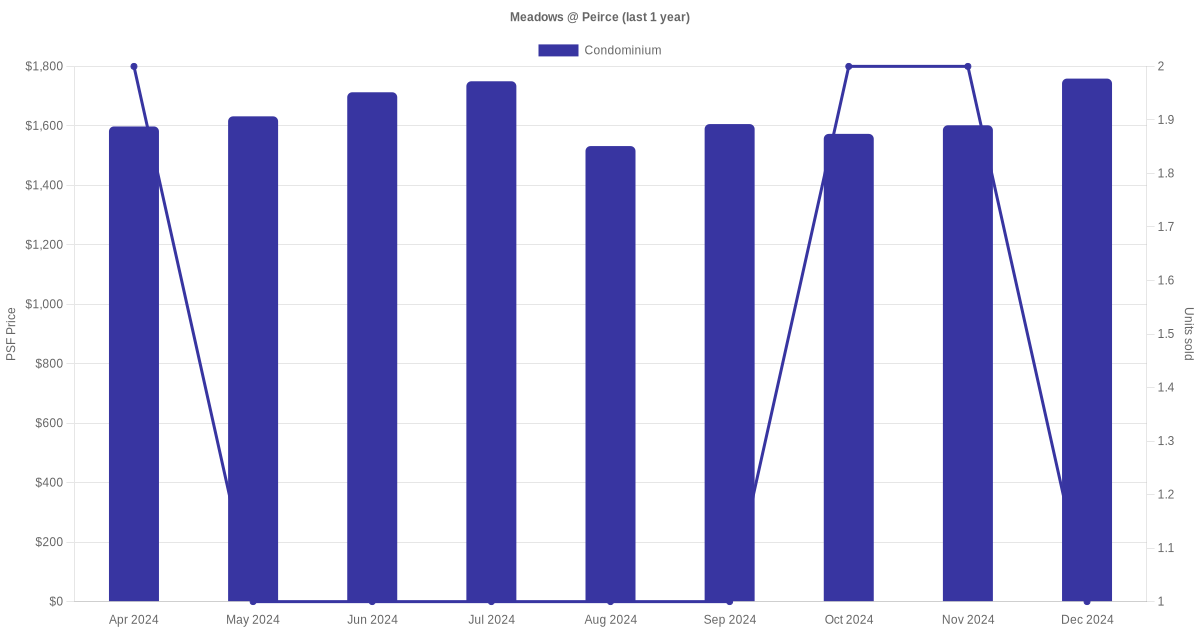 There were a total of 34 sales transactions for Meadows @ Peirce in the last 3 years, with the latest one recorded in Dec 2025. Disclaimer : our transactions data below does not include block numbers as the data is not available.