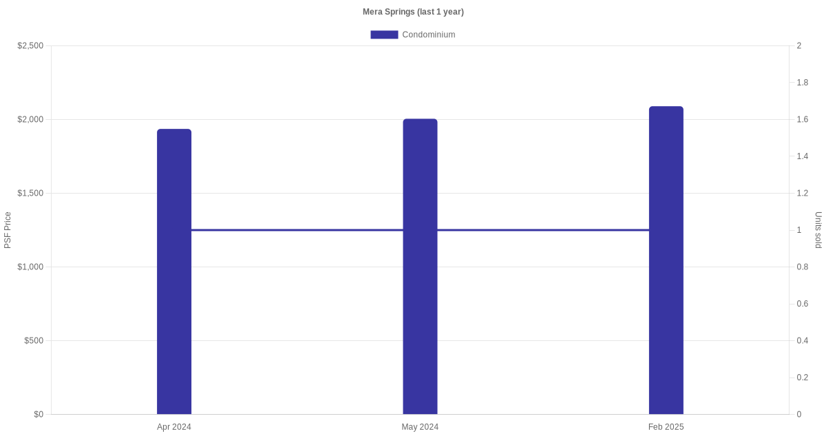There were a total of 8 sales transactions for Mera Springs in the last 3 years, with the latest one recorded in Feb 2025. Disclaimer : our transactions data below does not include block numbers as the data is not available.
