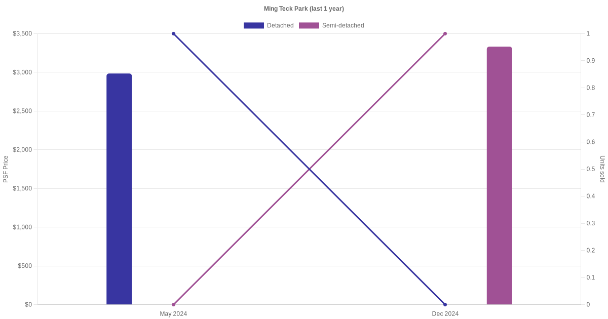 The graph below shows the average monthly transacted sale price for each of the detached, semi-detached and terrace units for Ming Teck Park in the last 3 years. This is based on the transactional data collated for Ming Teck Park for the selected period.