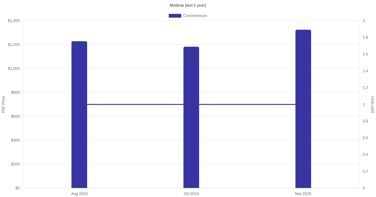 There were a total of 22 sales transactions for Modena in the last 3 years, with the latest one recorded in Nov 2025. Disclaimer : our transactions data below does not include block numbers as the data is not available.