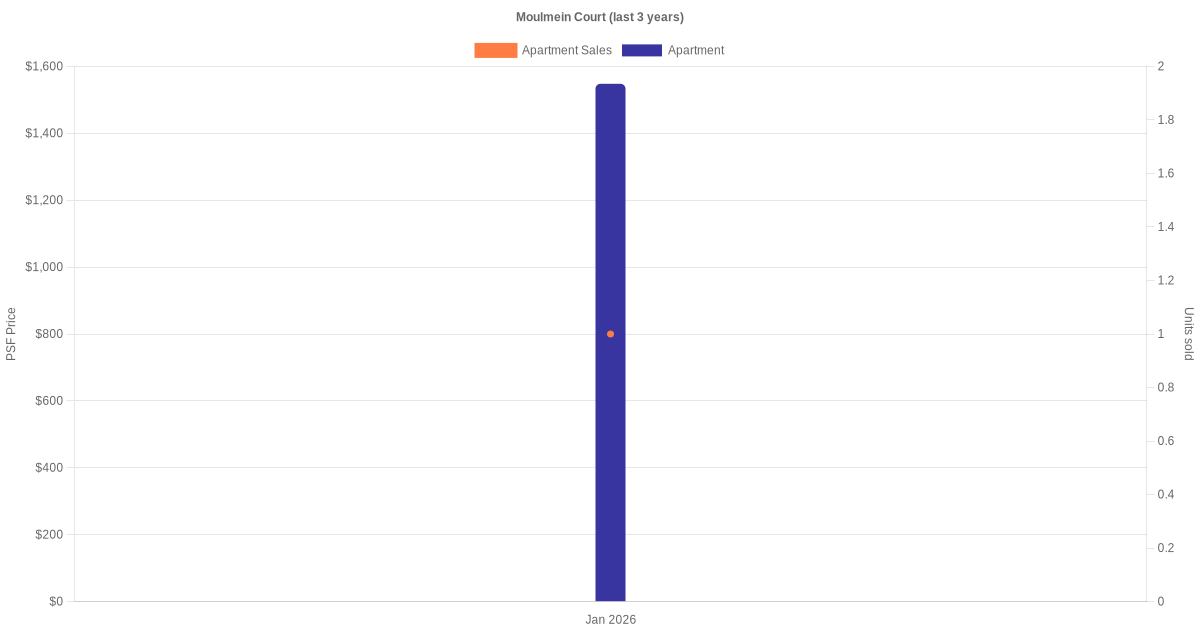 There were a total of 1 sales transactions for Moulmein Court in the last 3 years, with the latest one recorded in Jan 2026. Disclaimer : our transactions data below does not include block numbers as the data is not available. If you would like to see a list of blocks / addresses associated with Moulmein Court, please click here.