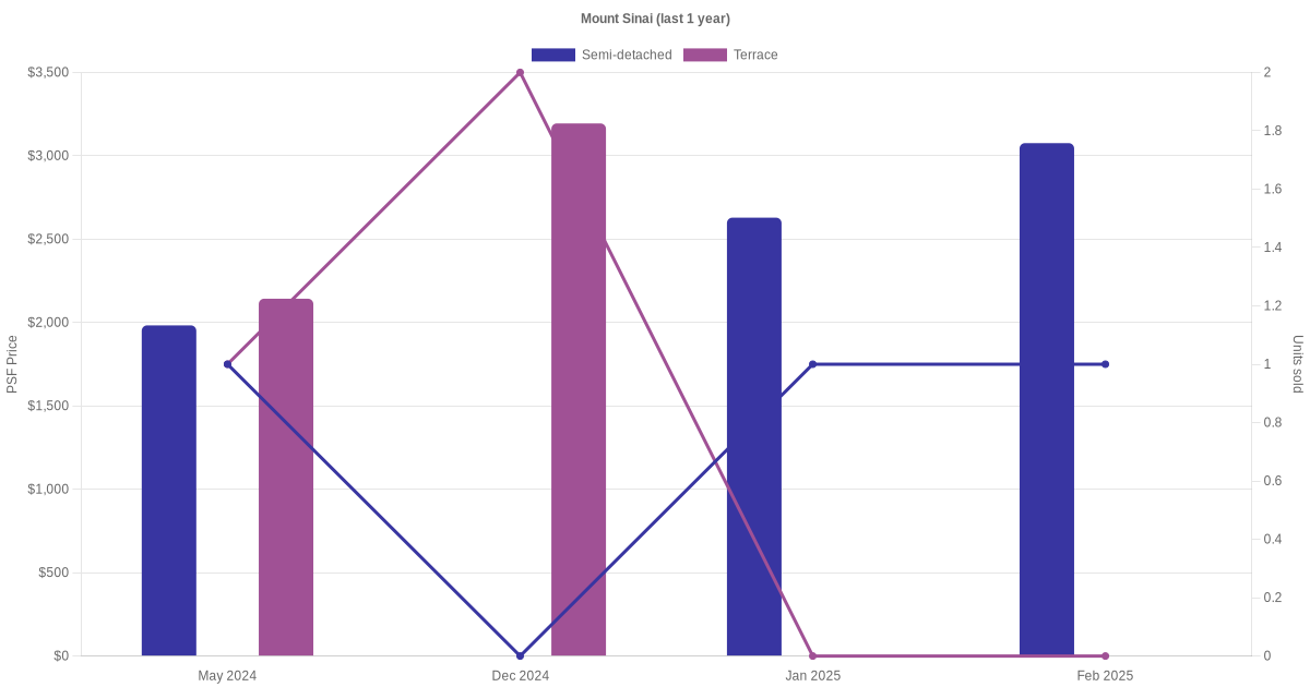 The graph below shows the average monthly transacted sale price for each of the semi-detached and terrace units for Mount Sinai in the last 3 years. This is based on the transactional data collated for Mount Sinai for the selected period.