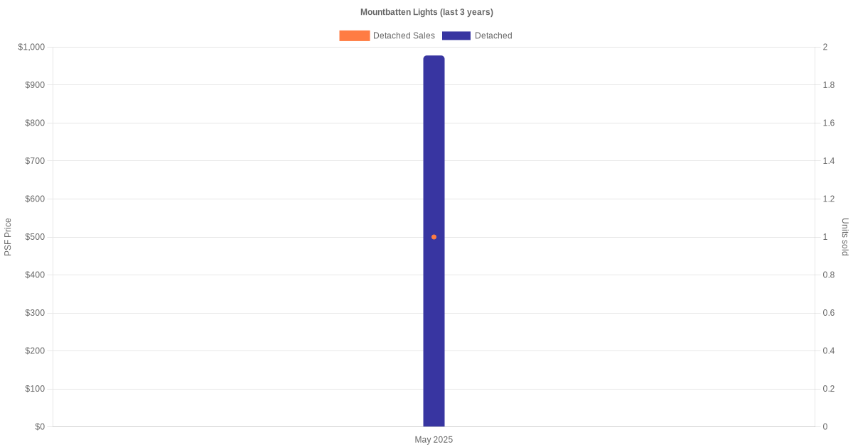 There were a total of 1 sales transactions for Mountbatten Lights in the last 3 years, with the latest one recorded in May 2025. Disclaimer : our transactions data below does not include block numbers as the data is not available. If you would like to see a list of blocks / addresses associated with Mountbatten Lights, please click here.