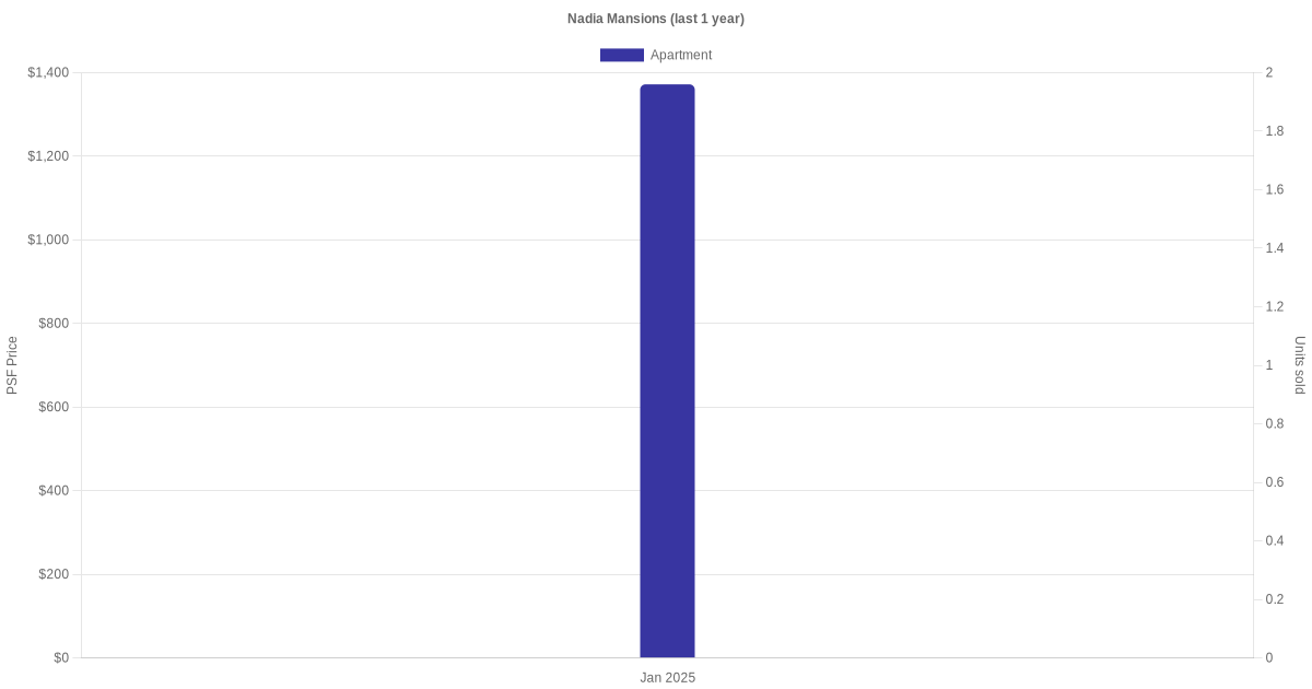 There were a total of 1 sales transactions for Nadia Mansions in the last 3 years, with the latest one recorded in Jan 2025. Disclaimer : our transactions data below does not include block numbers as the data is not available. If you would like to see a list of blocks / addresses associated with Nadia Mansions, please click here.