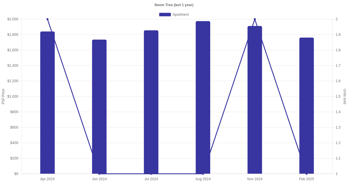 There were a total of 15 sales transactions for Neem Tree in the last 3 years, with the latest one recorded in Oct 2025. Disclaimer : our transactions data below does not include block numbers as the data is not available.
