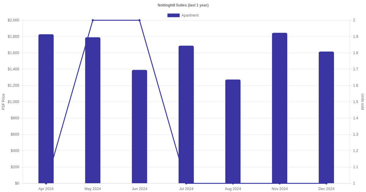 There were a total of 24 sales transactions for Nottinghill Suites in the last 3 years, with the latest one recorded in May 2025. Disclaimer : our transactions data below does not include block numbers as the data is not available.