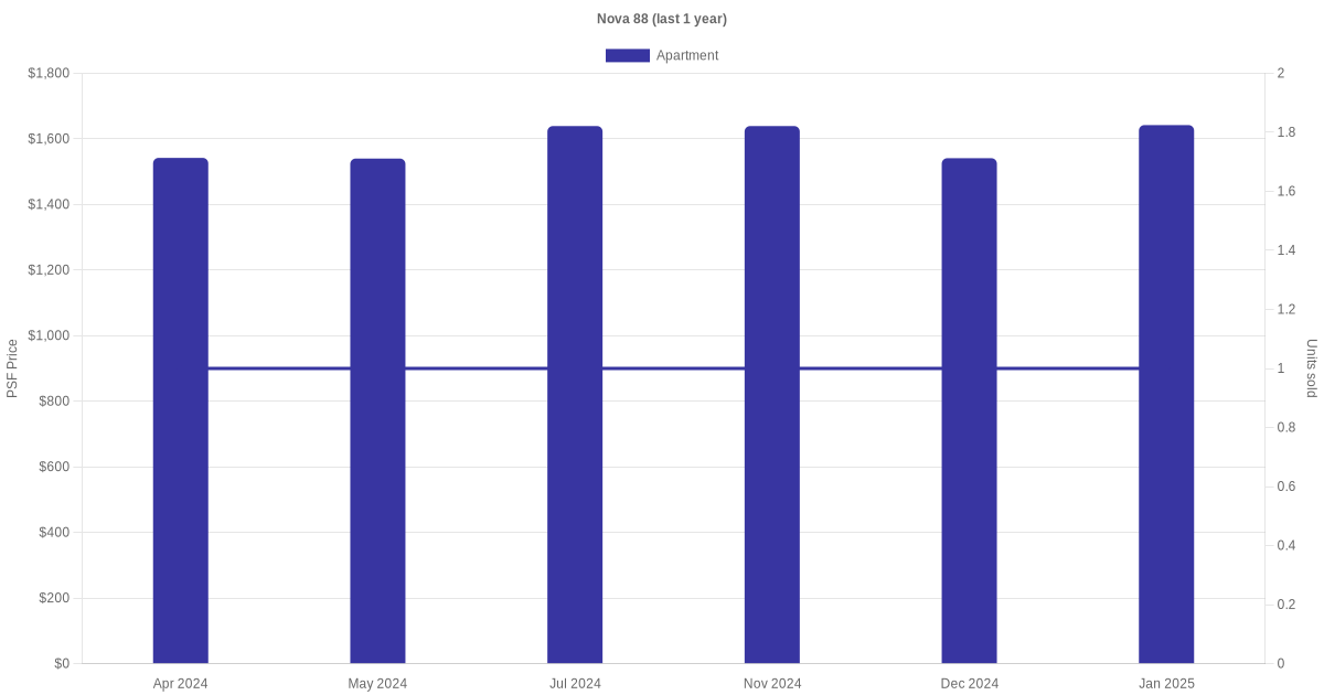 There were a total of 11 sales transactions for Nova 88 in the last 3 years, with the latest one recorded in Jan 2025. Disclaimer : our transactions data below does not include block numbers as the data is not available.