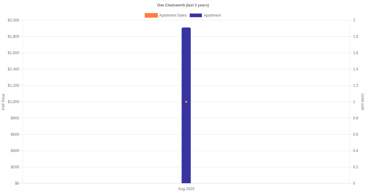There were a total of 1 sales transactions for One Chatsworth in the last 3 years, with the latest one recorded in Aug 2025. Disclaimer : our transactions data below does not include block numbers as the data is not available. If you would like to see a list of blocks / addresses associated with One Chatsworth, please click here.