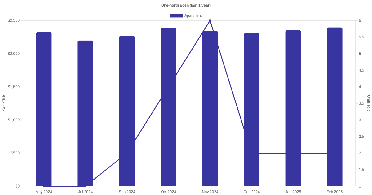 | Feb 2025 | $1,850,000 (Sub Sale) | $2,354 | Apartment | One-north Eden Slim Barracks Rise (District 05) | 06-10 | 786 sqft | 99 years | 2019 |