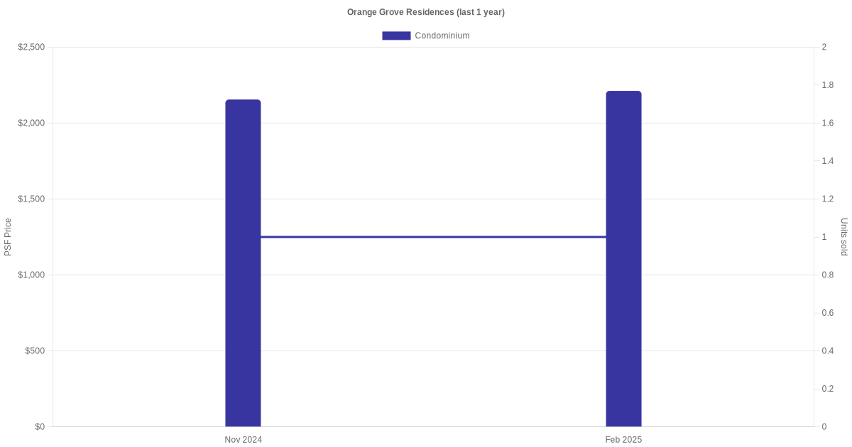 There were a total of 6 sales transactions for Orange Grove Residences in the last 3 years, with the latest one recorded in Feb 2025. Disclaimer : our transactions data below does not include block numbers as the data is not available.