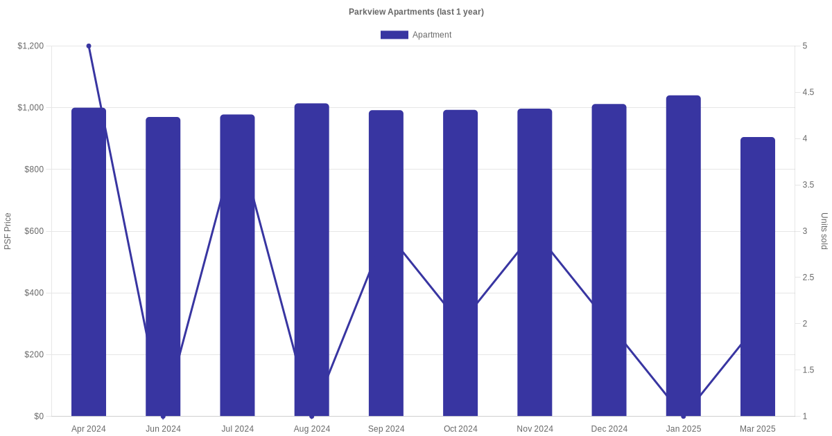 There were a total of 59 sales transactions for Parkview Apartments in the last 3 years, with the latest one recorded in Nov 2025. Disclaimer : our transactions data below does not include block numbers as the data is not available. If you would like to see a list of blocks / addresses associated with Parkview Apartments, please click here.