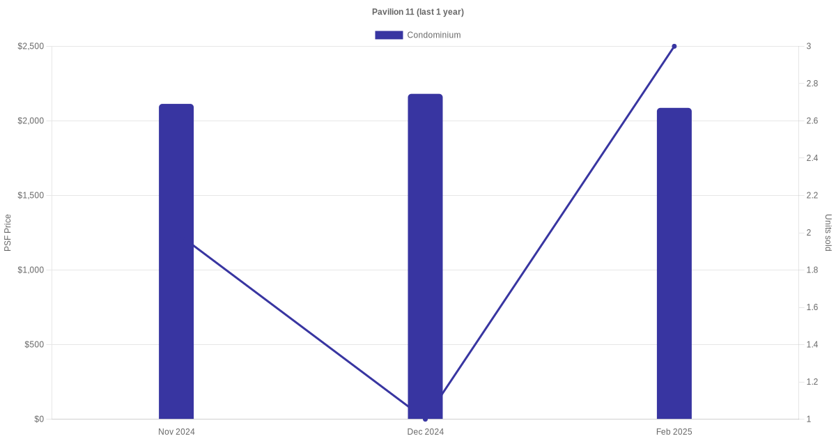 There were a total of 13 sales transactions for Pavilion 11 in the last 3 years, with the latest one recorded in Oct 2025. Disclaimer : our transactions data below does not include block numbers as the data is not available.