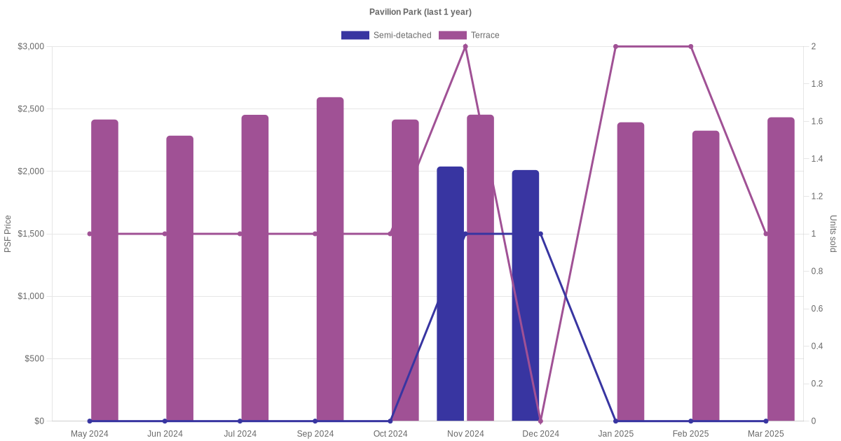 The graph below shows the average monthly transacted sale price for each of the semi-detached and terrace units for Pavilion Park in the last 3 years. This is based on the transactional data collated for Pavilion Park for the selected period.