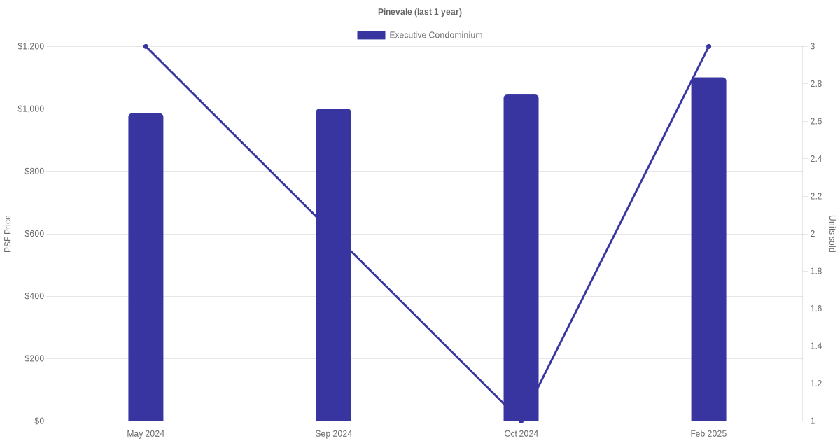 The graph below shows the average monthly transacted sale price for each of the executive condominium units for Pinevale in the last 3 years. This is based on the transactional data collated for Pinevale for the selected period.