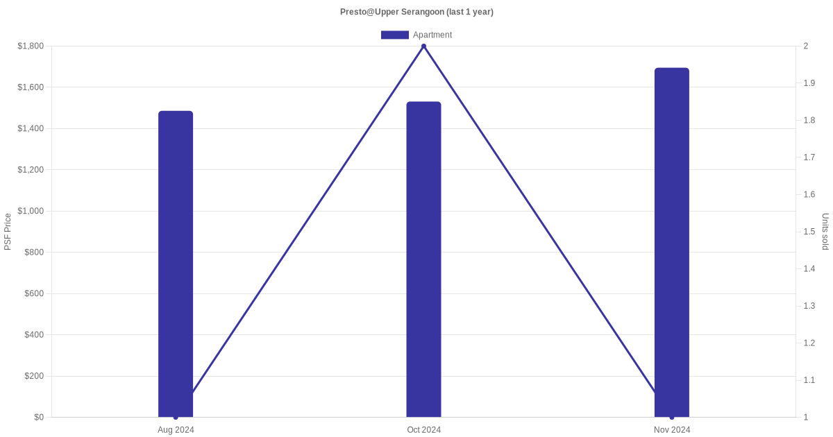 The graph below shows the average monthly transacted sale price for each of the apartment units for Presto@Upper Serangoon in the last 3 years. This is based on the transactional data collated for Presto@Upper Serangoon for the selected period.