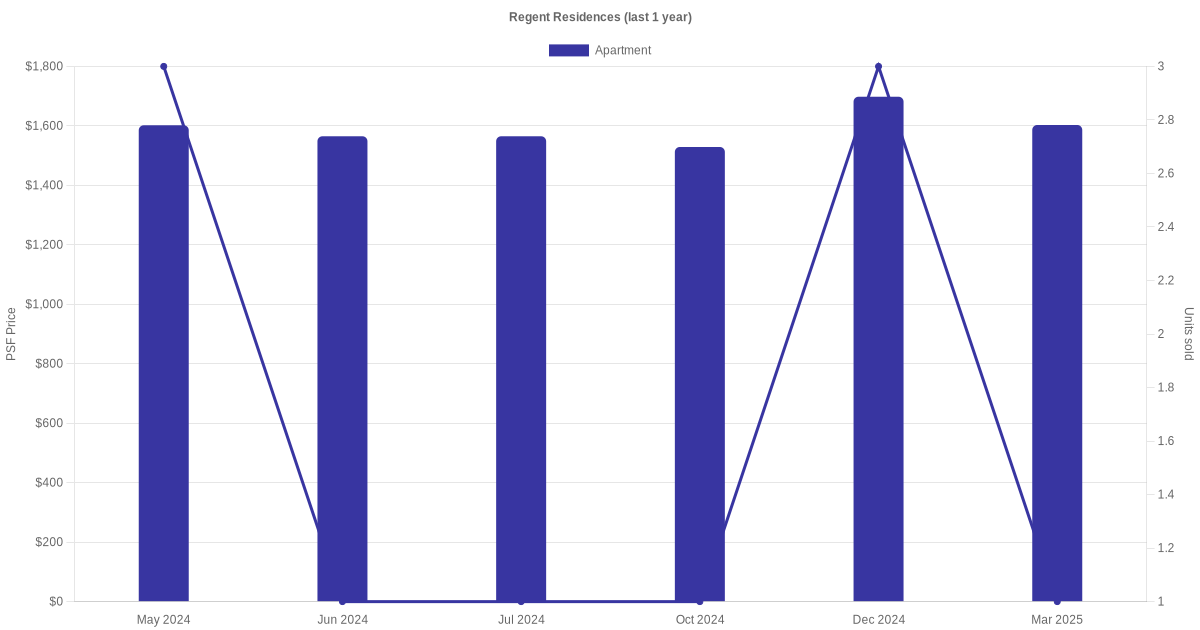 There were a total of 30 sales transactions for Regent Residences in the last 3 years, with the latest one recorded in Sep 2025. Disclaimer : our transactions data below does not include block numbers as the data is not available.