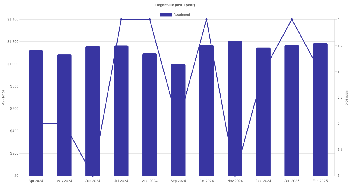 The graph below shows the average monthly transacted sale price for each of the apartment units for Regentville in the last 3 years. This is based on the transactional data collated for Regentville for the selected period.