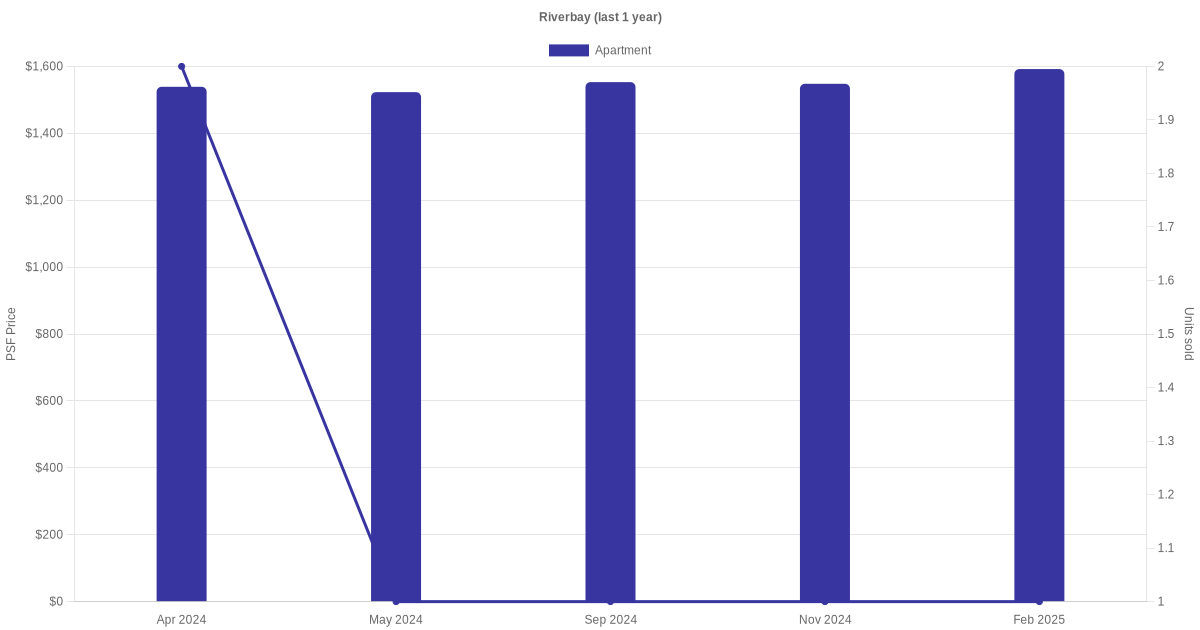 The graph below shows the average monthly transacted sale price for each of the apartment units for Riverbay in the last 3 years. This is based on the transactional data collated for Riverbay for the selected period.