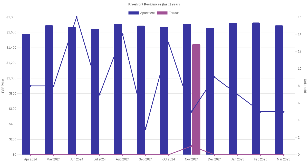 The graph below shows the average monthly transacted sale price for each of the apartment and terrace units for Riverfront Residences in the last 3 years. This is based on the transactional data collated for Riverfront Residences for the selected period.