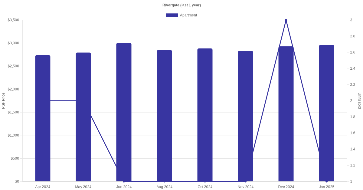 The graph below shows the average monthly transacted sale price for each of the apartment units for Rivergate in the last 3 years. This is based on the transactional data collated for Rivergate for the selected period.