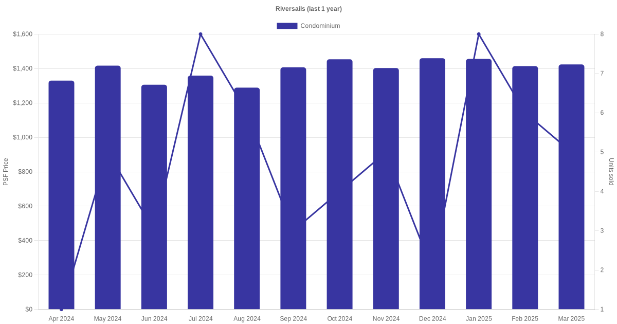The graph below shows the average monthly transacted sale price for each of the condominium units for Riversails in the last 3 years. This is based on the transactional data collated for Riversails for the selected period.
