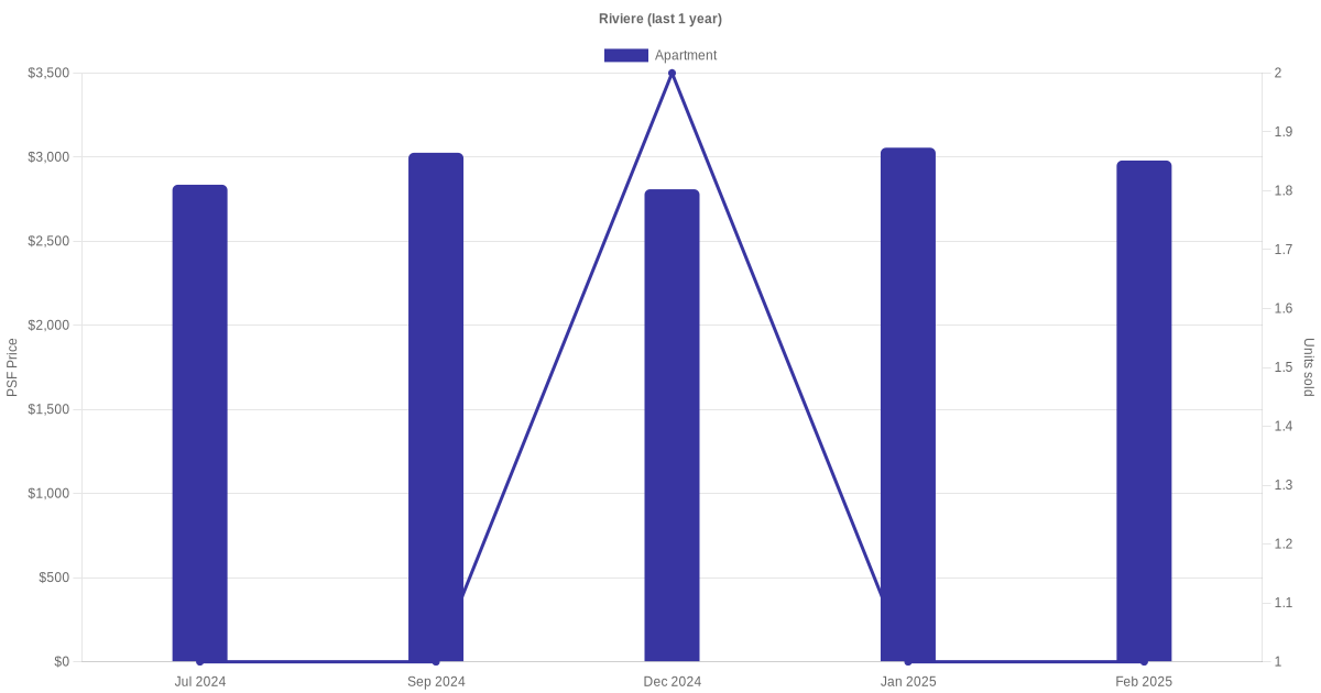 There were a total of 50 sales transactions for Riviere in the last 3 years, with the latest one recorded in Nov 2025. Disclaimer : our transactions data below does not include block numbers as the data is not available. If you would like to see a list of blocks / addresses associated with Riviere, please click here.