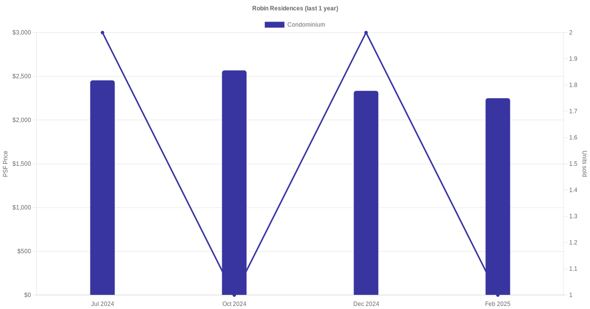 There were a total of 13 sales transactions for Robin Residences in the last 3 years, with the latest one recorded in Oct 2025. Disclaimer : our transactions data below does not include block numbers as the data is not available.