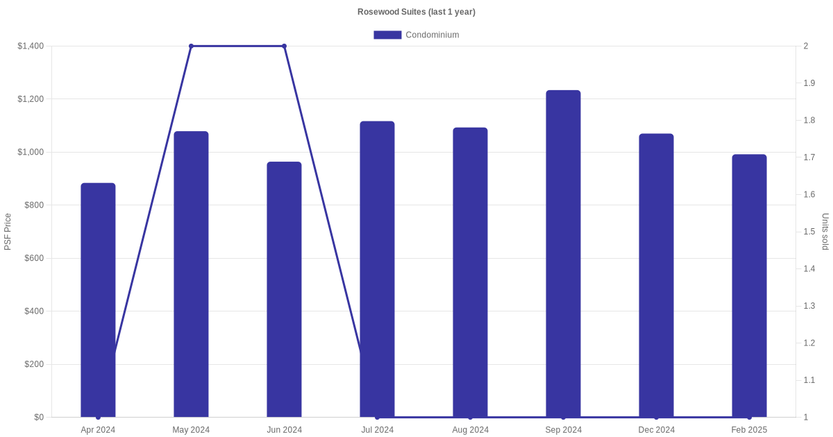 There were a total of 22 sales transactions for Rosewood Suites in the last 3 years, with the latest one recorded in Oct 2025. Disclaimer : our transactions data below does not include block numbers as the data is not available.