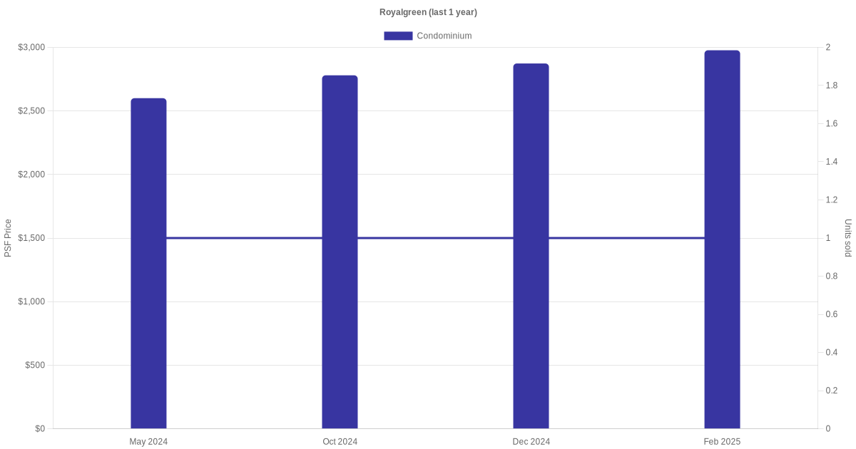The graph below shows the average monthly transacted sale price for each of the condominium units for Royalgreen in the last 3 years. This is based on the transactional data collated for Royalgreen for the selected period.