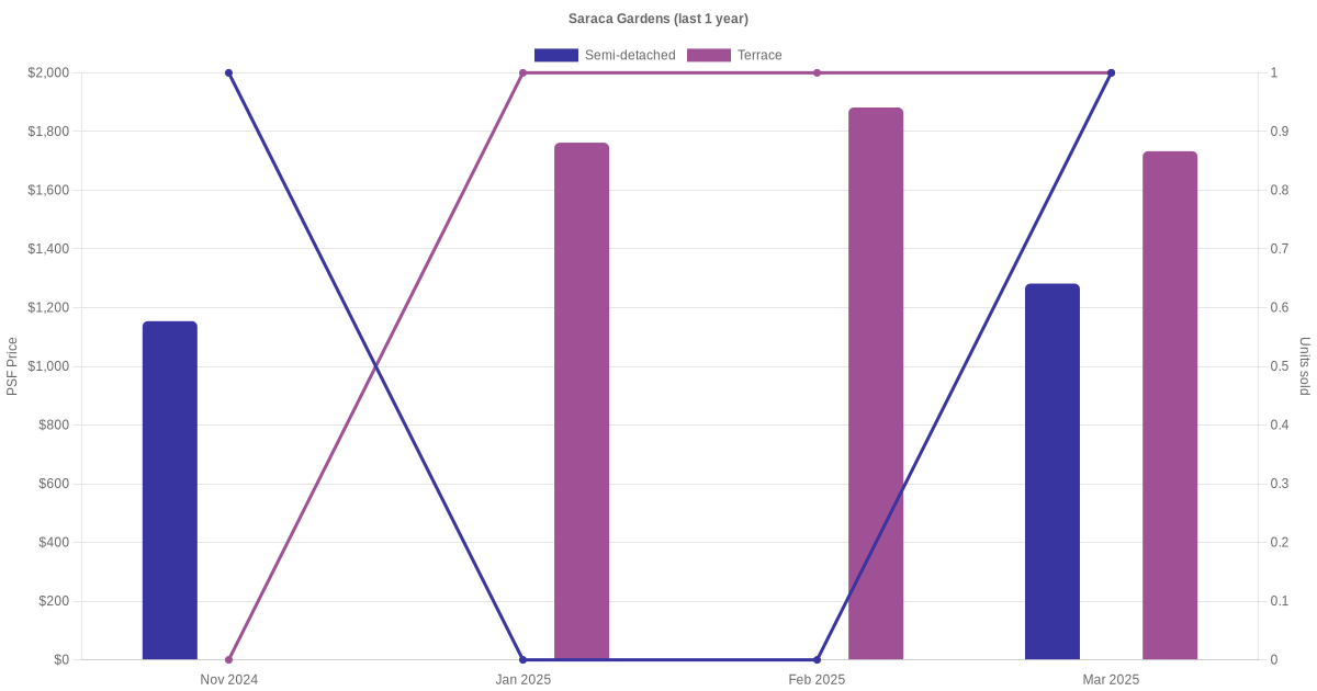 There were a total of 7 sales transactions for Saraca Gardens in the last 3 years, with the latest one recorded in Jul 2025. Disclaimer : our transactions data below does not include block numbers as the data is not available.