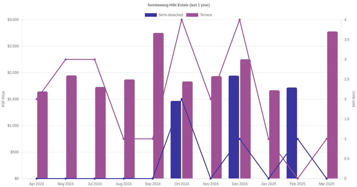 The graph below shows the average monthly transacted sale price for each of the detached, semi-detached and terrace units for Sembawang Hills Estate in the last 3 years. This is based on the transactional data collated for Sembawang Hills Estate for the selected period.