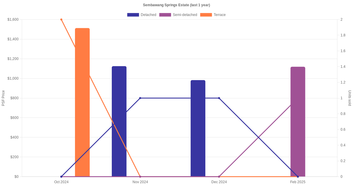 There were a total of 33 sales transactions for Sembawang Springs Estate in the last 3 years, with the latest one recorded in Dec 2025. Disclaimer : our transactions data below does not include block numbers as the data is not available.