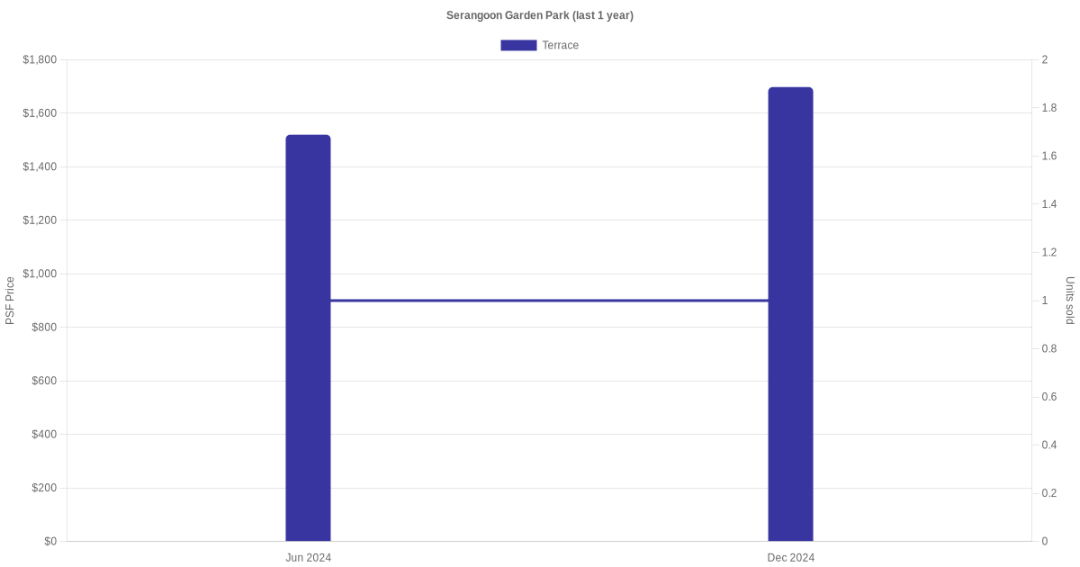 The graph below shows the average monthly transacted sale price for each of the terrace units for Serangoon Garden Park in the last 3 years. This is based on the transactional data collated for Serangoon Garden Park for the selected period.