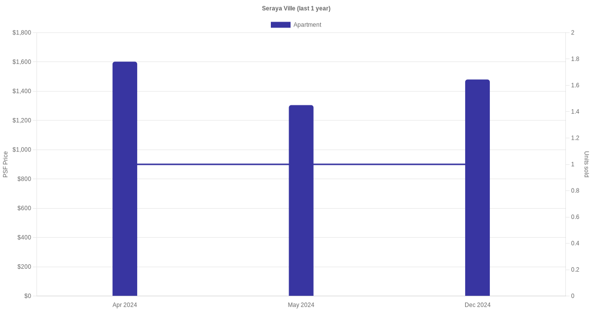 There were a total of 5 sales transactions for Seraya Ville in the last 3 years, with the latest one recorded in May 2025. Disclaimer : our transactions data below does not include block numbers as the data is not available.