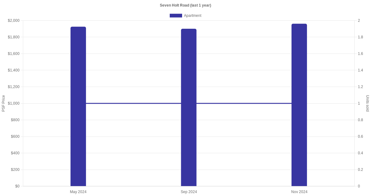 The graph below shows the average monthly transacted sale price for each of the apartment units for Seven Holt Road in the last 3 years. This is based on the transactional data collated for Seven Holt Road for the selected period.