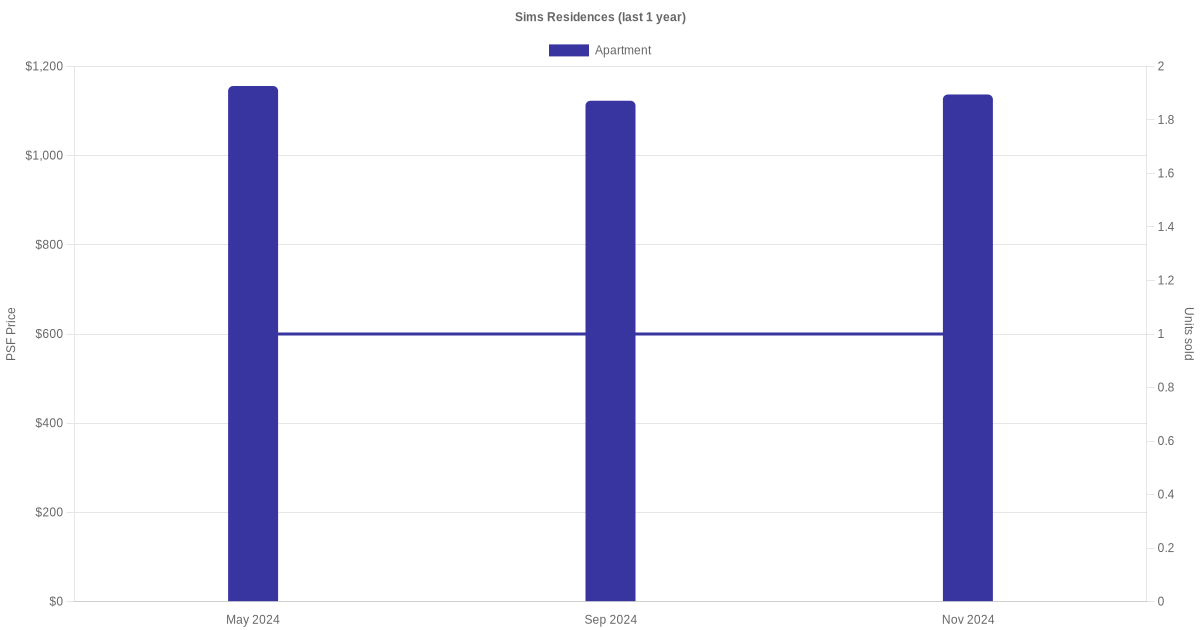 There were a total of 6 sales transactions for Sims Residences in the last 3 years, with the latest one recorded in Apr 2025. Disclaimer : our transactions data below does not include block numbers as the data is not available.