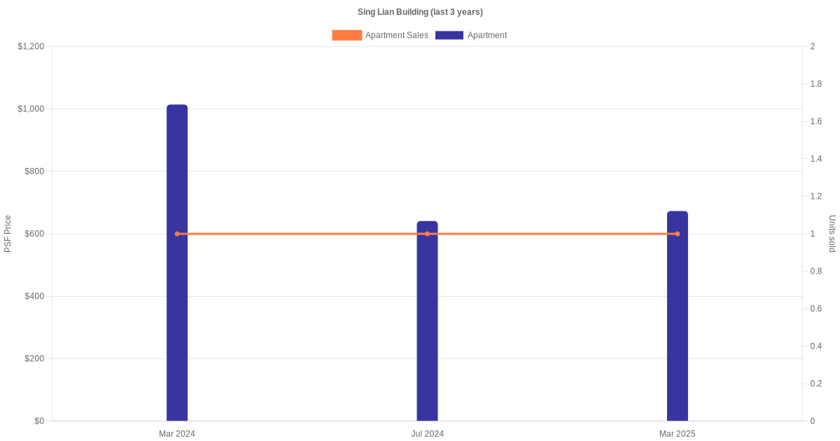 There were a total of 3 sales transactions for Sing Lian Building in the last 3 years, with the latest one recorded in Mar 2025. Disclaimer : our transactions data below does not include block numbers as the data is not available.