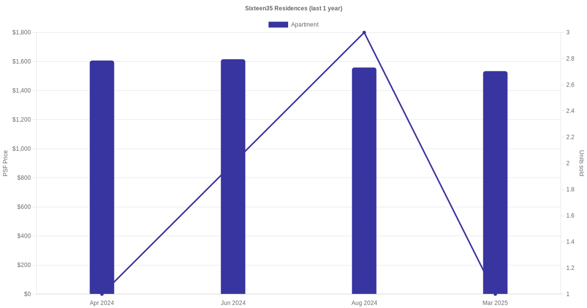 There were a total of 14 sales transactions for Sixteen35 Residences in the last 3 years, with the latest one recorded in Mar 2025. Disclaimer : our transactions data below does not include block numbers as the data is not available.