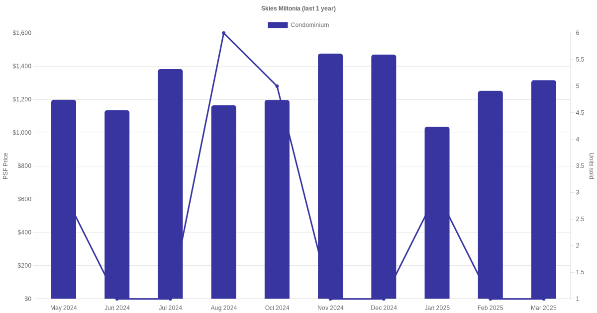 There were a total of 77 sales transactions for Skies Miltonia in the last 3 years, with the latest one recorded in Nov 2025. Disclaimer : our transactions data below does not include block numbers as the data is not available.