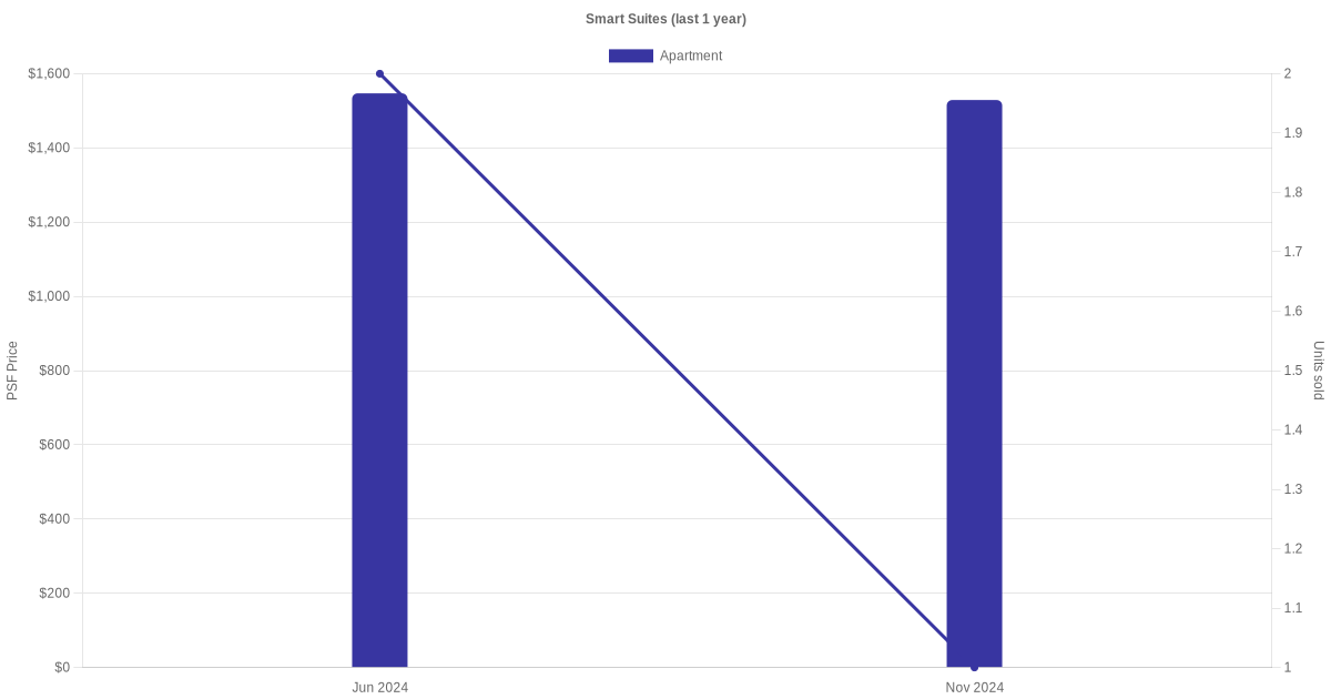 There were a total of 9 sales transactions for Smart Suites in the last 3 years, with the latest one recorded in Jun 2025. Disclaimer : our transactions data below does not include block numbers as the data is not available.