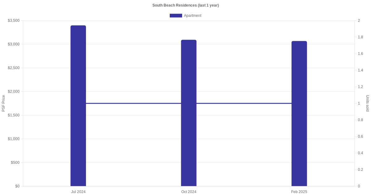 There were a total of 5 sales transactions for South Beach Residences in the last 3 years, with the latest one recorded in Oct 2025. Disclaimer : our transactions data below does not include block numbers as the data is not available.