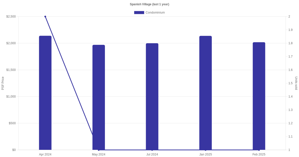 There were a total of 11 sales transactions for Spanish Village in the last 3 years, with the latest one recorded in Sep 2025. Disclaimer : our transactions data below does not include block numbers as the data is not available.